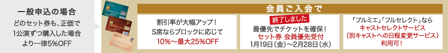 - ●セット券価格は正価の合計金額に対して割引した後、端数を切り捨てています。また、各種割引はセット券価格からの割引になります(ただし、ジュニア割引、障害者割引は正価からの割引です)。
