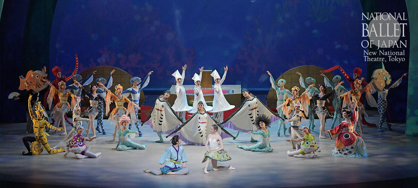 この亀は、竜宮城のプリンセスだったのです。辿りついた竜宮城では楽しい宴が始まり、美味しいお酒と料理、魚たちの歌と踊りで太郎は厚い接待を受けます。とりわけ亀の姫の舞は、妙なる美しさでした。心の優しい太郎に惹かれた姫と太郎は互いに心を寄せ合い、恋に落ちます。