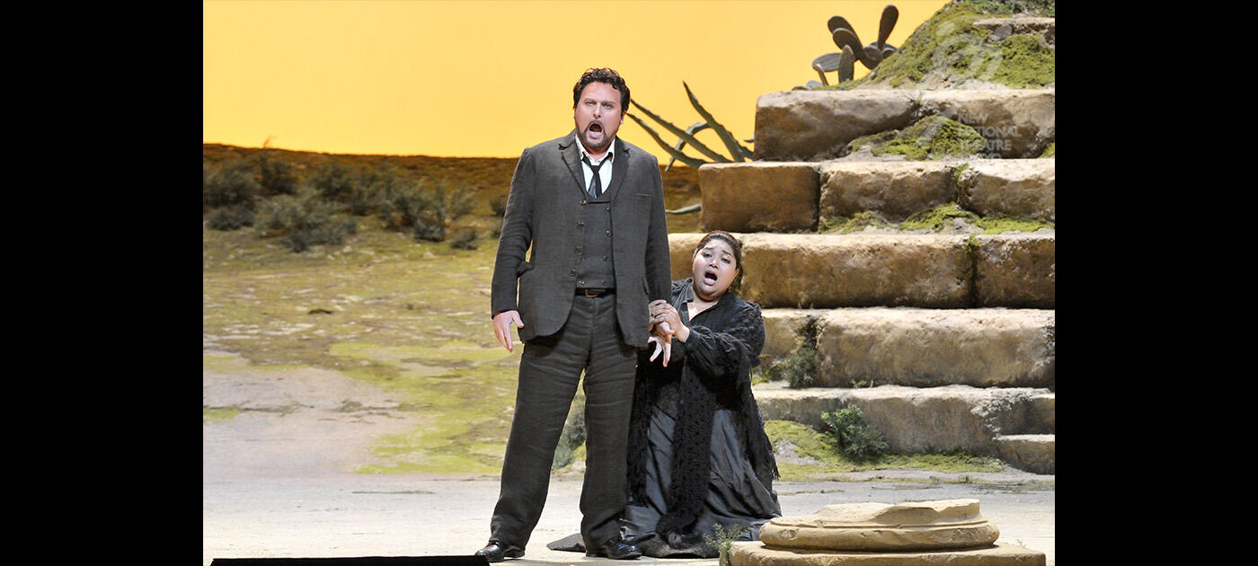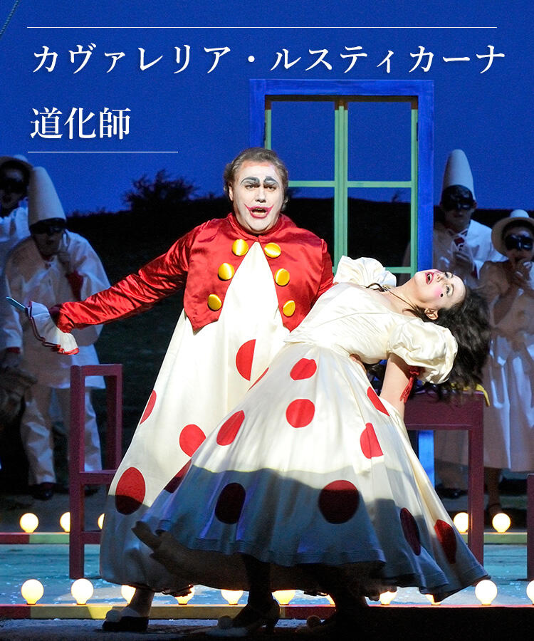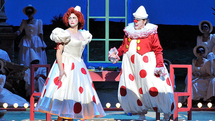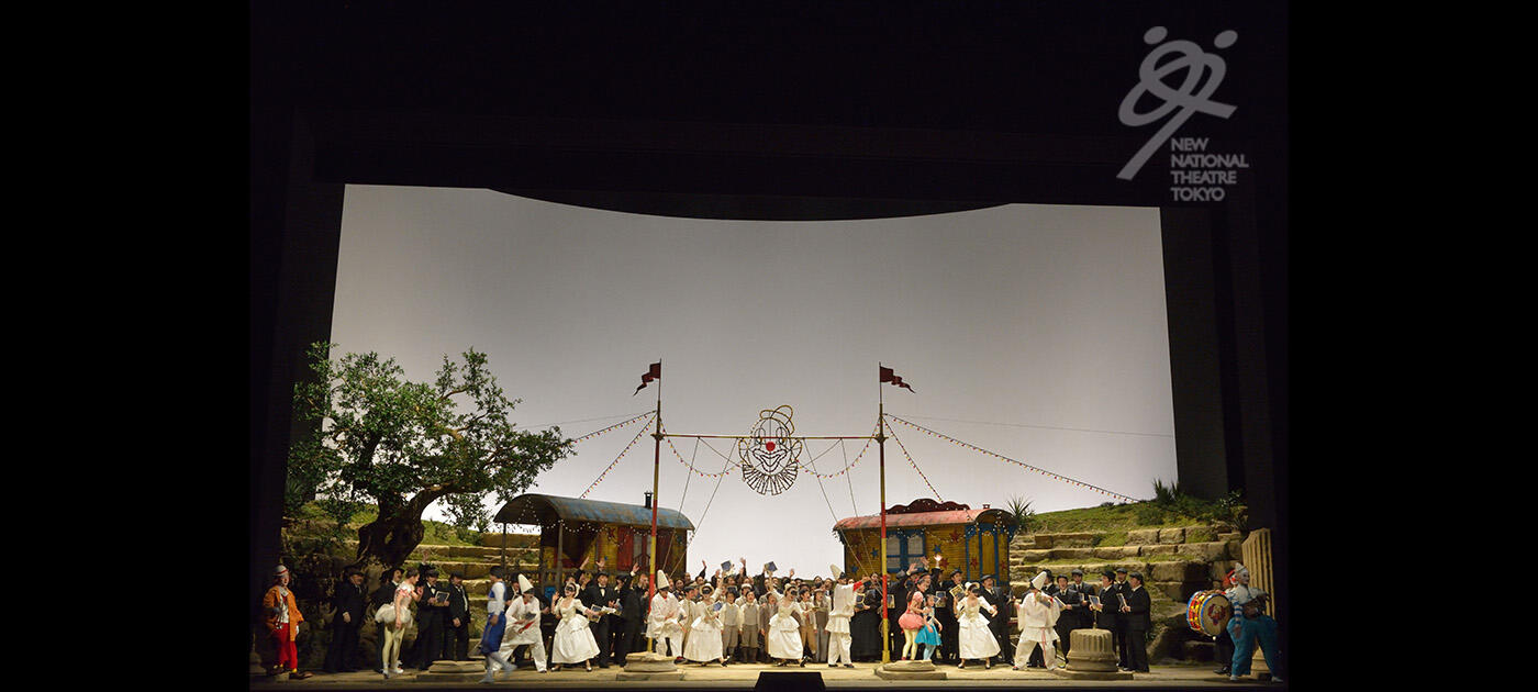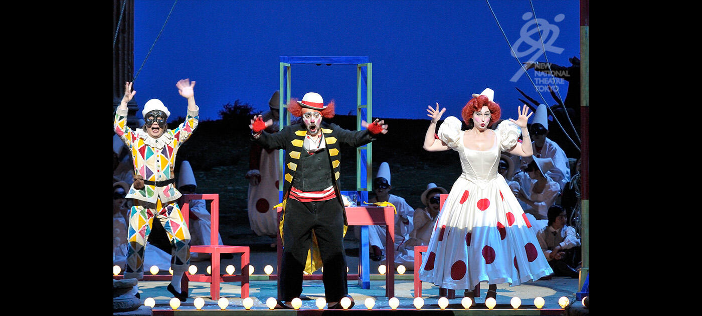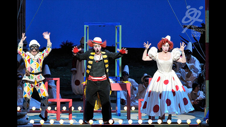 【第1幕】町に旅芝居の一座がやって来る。トニオは座長の妻ネッダに気があるが、相手にされない。町にはネッダの愛人シルヴィオがいた。二人の密会を見ていたトニオはカニオに知らせる。激昂したカニオは妻をナイフで脅すが、ネッダは口を割らない。カニオは、逆上しながらも道化芝居を演じなければならない自分の境遇を嘆きながら、化粧をして衣裳を着ける。