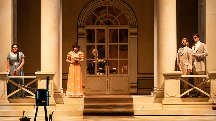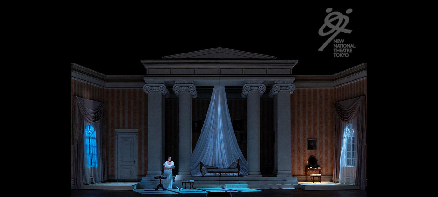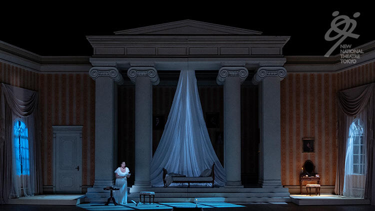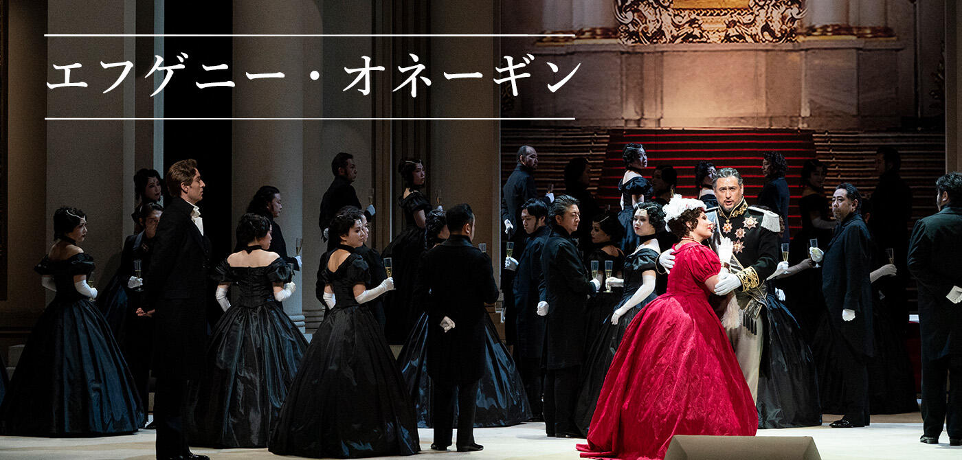【第1幕】ラーリン邸。農村の女地主ラーリナの二人の娘、読書好きで物静かな姉のタチヤーナと陽気で外交的な妹オリガのもとを、オリガの婚約者のレンスキーが、友人オネーギンを連れて訪れる。タチヤーナは一目でオネーギンへの恋に落ちる。その夜、眠れないタチヤーナは意を決してオネーギンへの恋文をしたため、オネーギンへ届けさせる。ラーリン家の庭にオネーギンが現れ、タチヤーナに手紙を返す。ニヒリストのオネーギンは、自分は結婚生活に向かない人間だと冷たく告げ、タチヤーナに自制することを学ぶよう諭す。