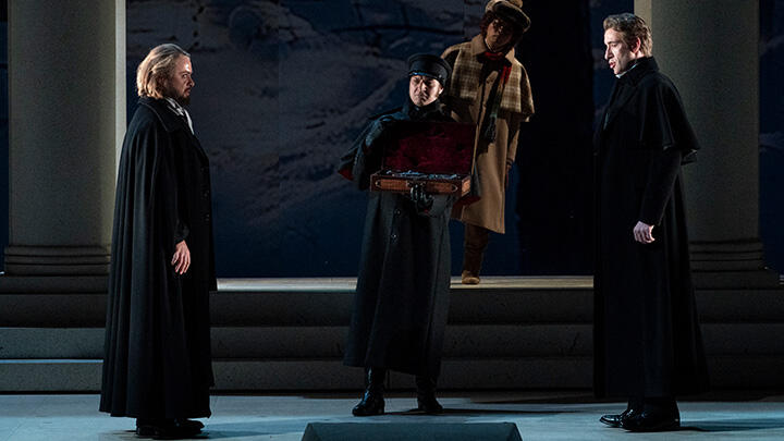 【第2幕】ラーリン家の舞踏会。オネーギンがタチヤーナと踊っていると、客たちは二人の噂話を交わす。オネーギンはつまらない舞踏会に自分を誘ったレンスキーへの腹いせにオリガとばかり踊る。これを侮辱と捉えたレンスキーはオネーギンと激しく口論し、ついに決闘を申し込む。凍てつく冬の朝、決闘場所の水車小屋でオネーギンを待つレンスキーは、過ぎた日を懐かしむ。オネーギンが到着し、介添人の下で決闘が行われる。オネーギンが撃つとレンスキーが倒れ、オネーギンは友人の死におののく。