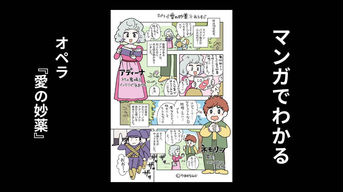 ベルカント・オペラを代表する作曲家ドニゼッティの人気オペラ・ブッファ(喜劇)。偽の惚れ薬"愛の妙薬"をめぐる、コミカルでちょっぴりホロリとする恋の物語で、世界中で愛される人気作です。テノール屈指の名アリア「人知れぬ涙」をはじめ、ネモリーノのカヴァティーナ「なんて美しい!」、アディーナの告白のアリア「受け取って、私のおかげであなたは自由」、そしてドゥルカマーラの超絶技巧たっぷりの口上「お聞きあれ、村の皆様」と、色とりどりの美しいナンバーが盛り込まれています。