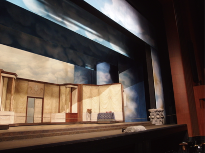 『ドン・パスクワーレ』の舞台はローマ。古代遺跡が身近にある町をあらわすかのように、舞台の両脇には古代建築の柱が。さらにはプロンプターボックスも、柱が置いてあるような形になっています。