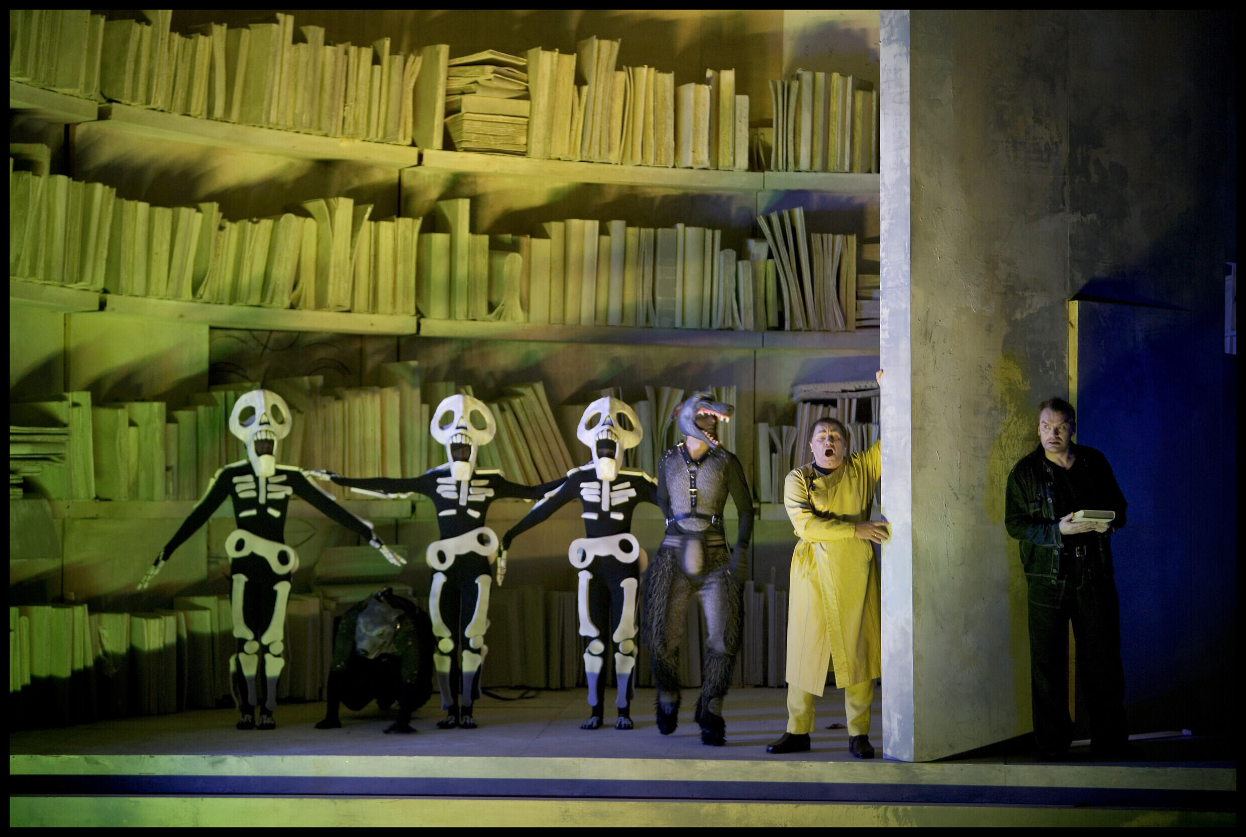 ひと目見た瞬間には単なるインパクト狙いにも見える、舞台上のちょっと突飛な背景や衣裳、オブジェが、上演が進むうちに作品の深淵を見せるための重要な補助線となり、観客をはっとさせる。その土台にあるのは彼の的確な音楽・台本の読解とユニークな想像力であり、また彼のヴィジョンを具体的に視覚化する舞台美術家たち─『チェーザレ』を担当したナイジェル・ロウリー、そしてジョン・マクファーレン(『スペードの女王』)、ポール・スタインバーグ(『ルル』)、ミリアム・ブーザー(『ボリス・ゴドゥノフ』)ほかの名デザイナーたち─との協働である。今回の『ヴォツェック』担当のアントニー・マクドナルドは、その「歴史書を読む巨大な骸骨」が湖上舞台となっている舞台写真が有名なブレゲンツ音楽祭での『仮面舞踏会』、『ラ・ボエーム』で共同演出もした間柄。今回もわれわれを驚かせてくれるに違いない。