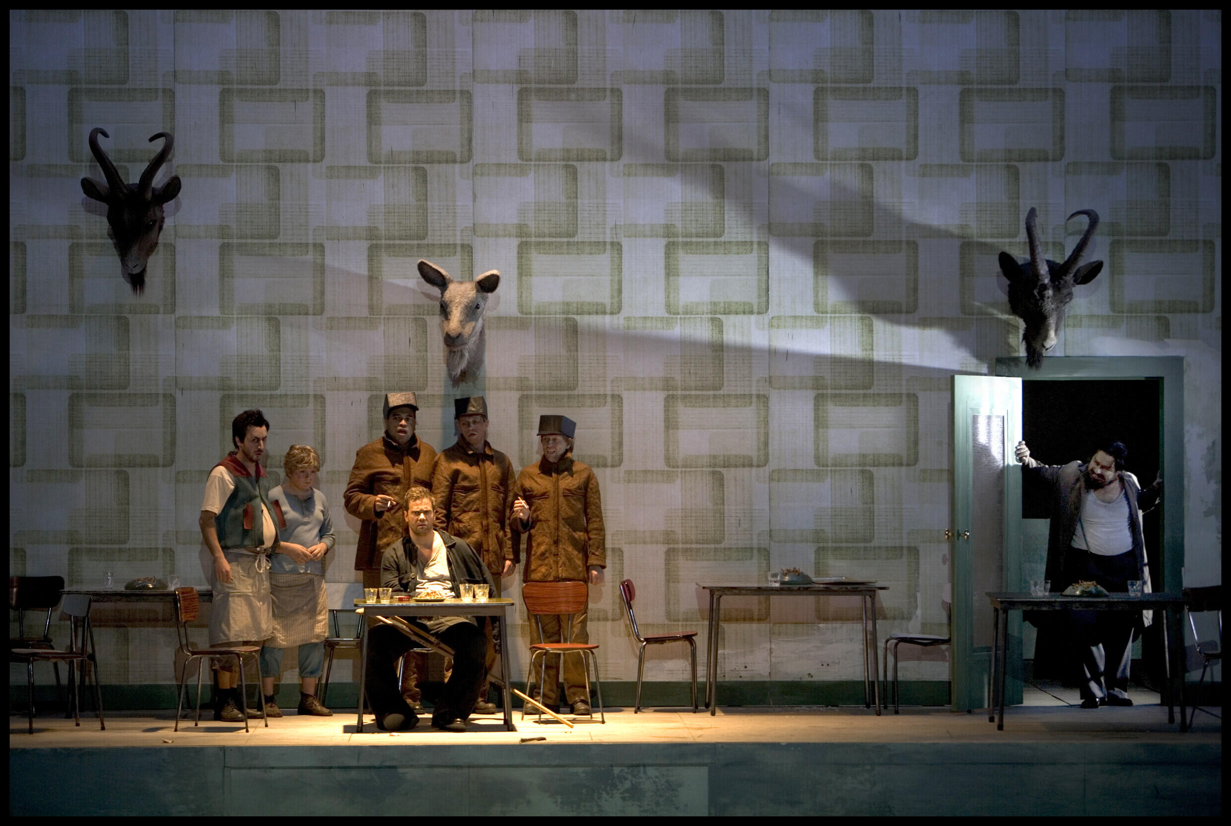 ジョーンズはすでにベルクの二本のオペラを両方演出している。ここでも作品の核をつかみ視覚化する技が冴えていた。『ルル』(ENO)では、3幕で暴落する「ユングフラウ株券」の券面にアメリカで人気のあったセクシーなピンナップ・ガールの絵を使い、壁一面に巨大サイズのそれを大胆に貼りつけた。「ユングフラウ」すなわち「処女」性、女性の価値もまた株と同じく人々の欲望や価値観によってその「値」が変動するものだということ、『ルル』3幕におけるその残酷さと虚しさをこれほどあざやかに提示した舞台はほかにないだろう。