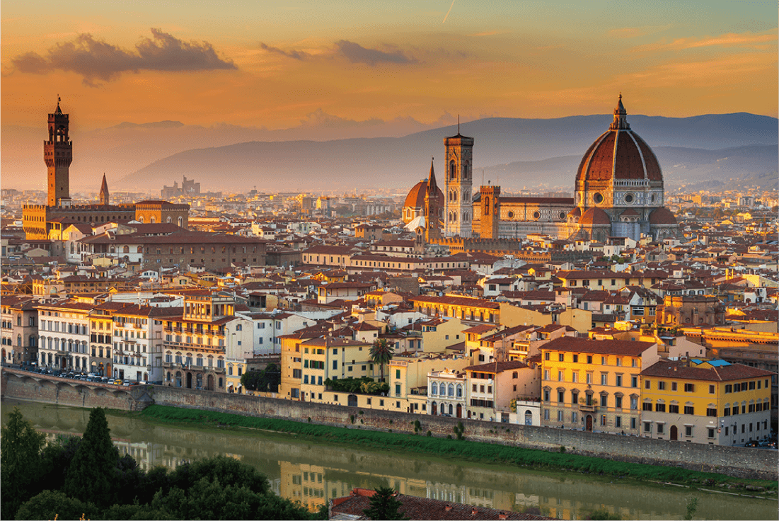 アルノ川とヴェッキオ宮殿の見える夕景プッチーニが書いた唯一の喜劇オペラ《ジャンニ・スキッキ》は1299年のフィレンツェを舞台にしています(新国立劇場の粟國淳演出のプロダクションは1950年代に時代を移しています)。台本作家のジョヴァッキーノ・フォルツァーノはフィレンツェ出身で日頃から、この町で生まれた詩聖ダンテの『神曲』を愛読していました。プッチーニが《三部作》の三作目に喜劇的なオペラを必要とした時に、『神曲』の中のこのエピソードを提案したそうです。ダンテは1265年に生まれ1301年に政争でこの町を追放されるまでフィレンツェの市政の中心で活躍していました。当時のフィレンツェは、サンタ・マリア・デル・フィオーレ大聖堂が数年前に着工し、政庁舎となるヴェッキオ宮殿はまさに1299年に建設が始まったばかりでした。このオペラの中で若いカップルのリヌッチョとラウレッタはそれぞれがフィレンツェにまつわる美しいアリアを歌いますが、特にリヌッチョの「フィレンツェは花咲ける木のごとく」は、シニョーリア広場、アルノ川、サンタ・クローチェ広場、アルノルフォ、ジョット、メディチ家などを列挙して、フィレンツェがいかに活気にあふれた素晴らしい町かを歌っています。