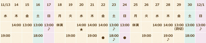 | 14:00 | 13:00 | 13:00 | 13:00 ♪ | 休演 | 14:00 | 14:00 | 14:00 | 13:00 ♪ | 13:00 | 休演 | 14:00 | 14:00 | 13:00 | 13:00 | 13:00 ♪ | |||