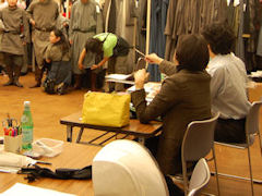 ![]() 衣裳の前田文子さん、演出の鵜山さん。素早く指示が飛びます ![]() 衣裳スタッフが大活躍。すごいスピードで丈を調整して決めていました |