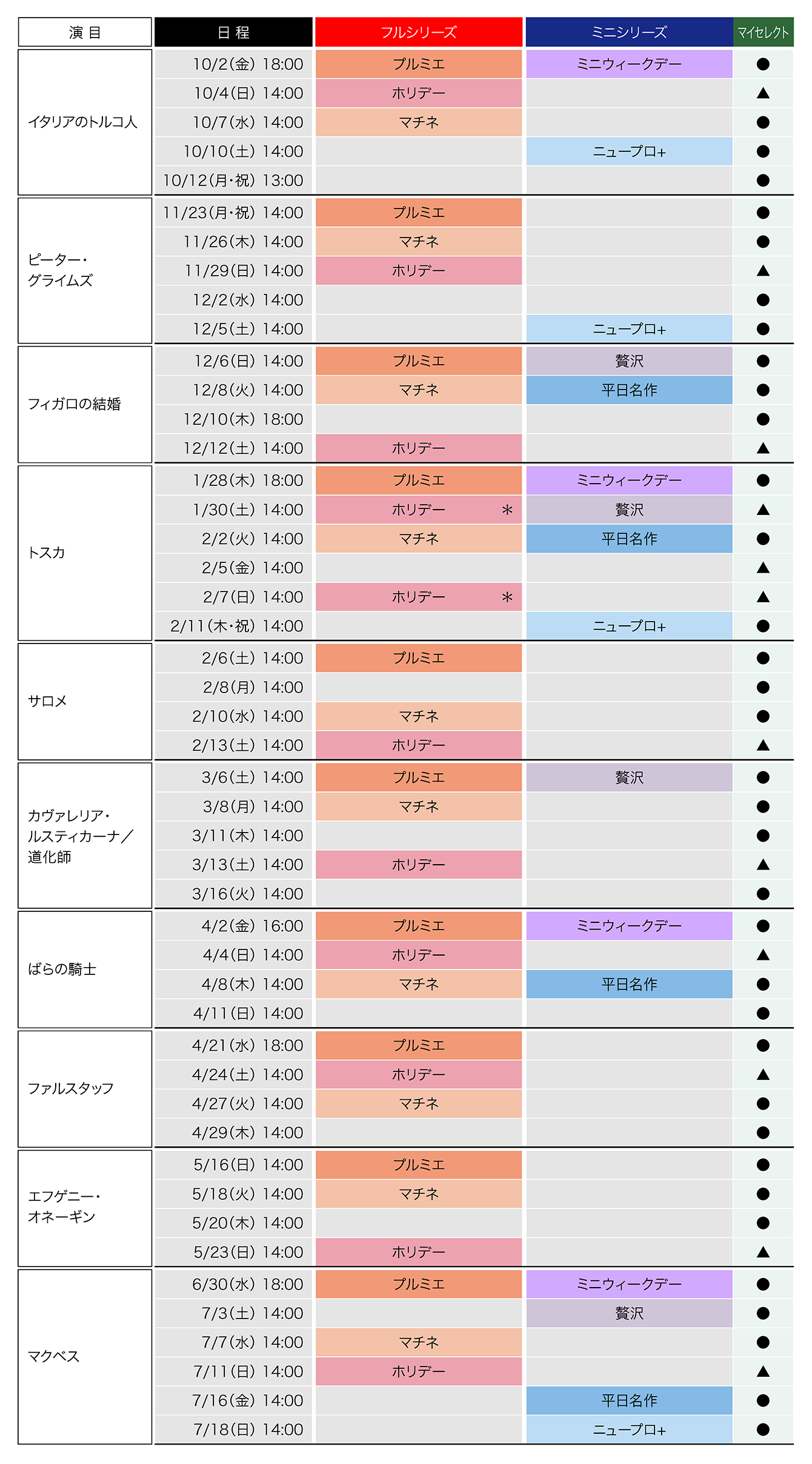 (▲はお申し込みの集中が予想され、お席に余裕がありません)「ホリデー」対象日の『トスカ』2/7(日)公演は、『サロメ』2/13(土)公演と近接日程となるため、お申込時に限り、1/30(土)公演を選択いただくことも可能です。