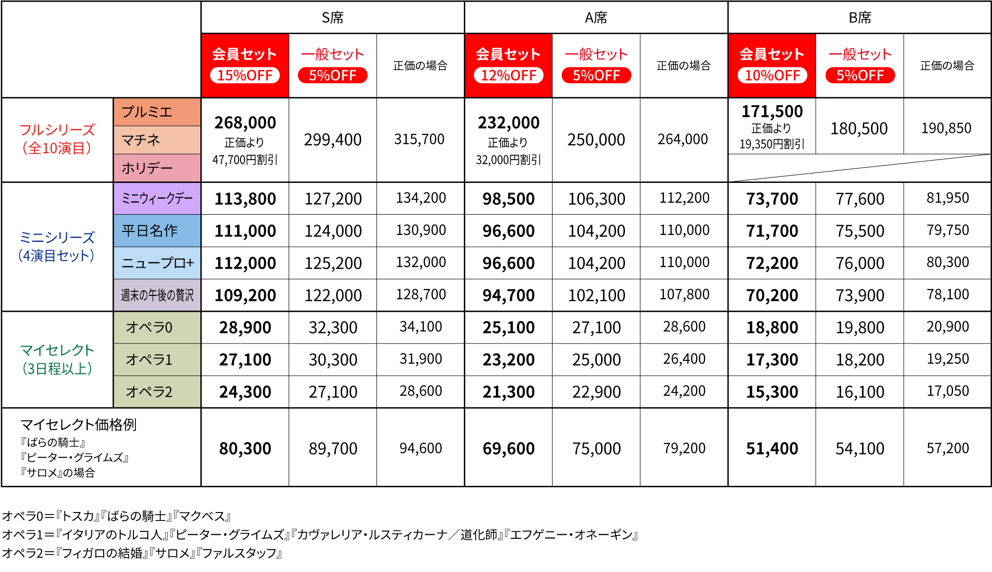 オペラセット券料金表 (円/税込)